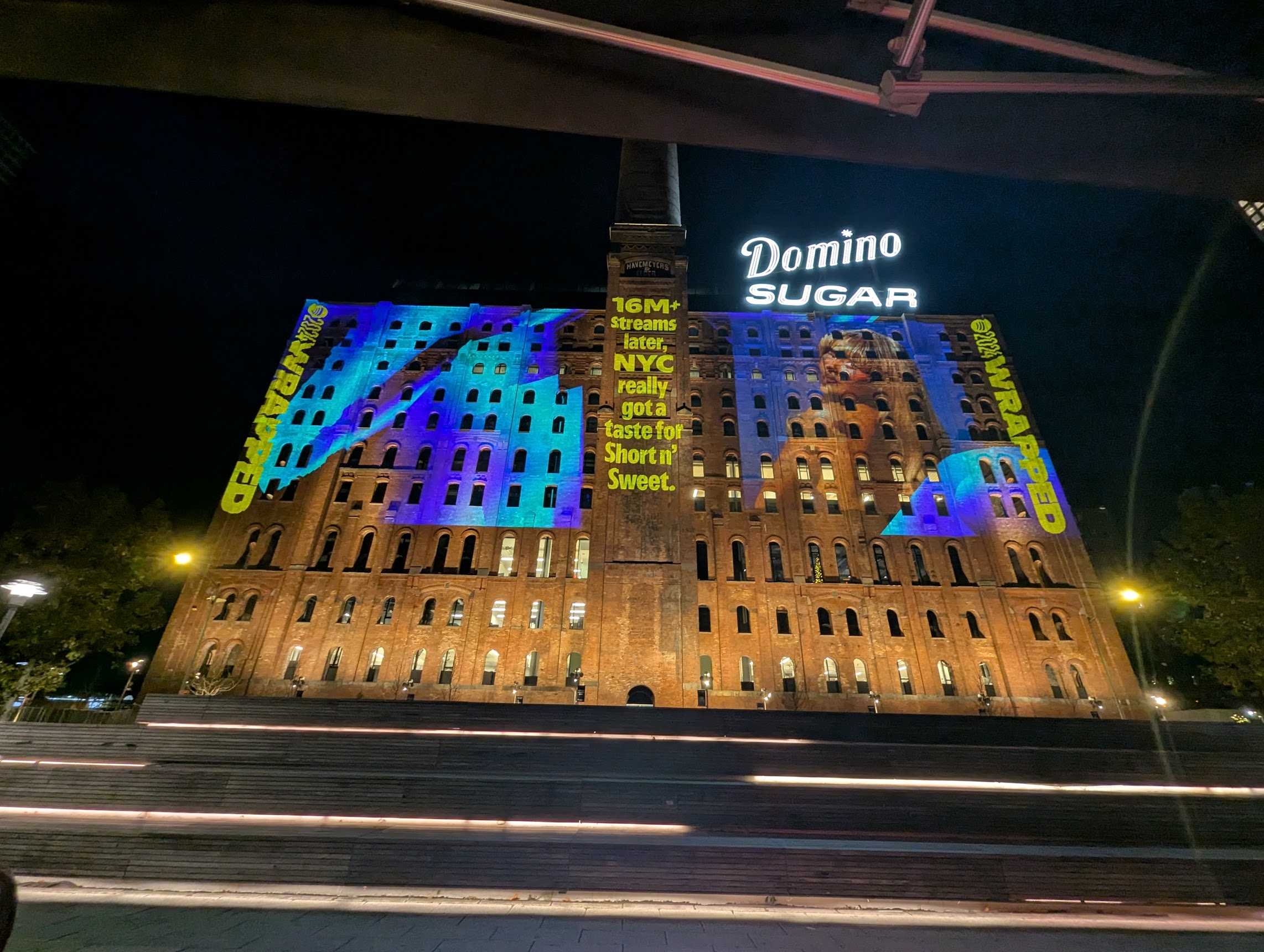 I have been the projectionist for this recurring job of a moving billboard on the Domino Sugar factory. It is controlled by disguise and runs with 18 projectors. This is a project by ATD Productions.