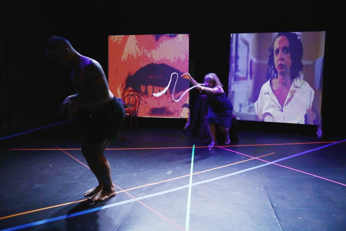 On this original play, I was the Projections and Lighting designer. I picked up the project halfway through, finishing up some content creation and programming it into a show using Isadora. This project used two screens on wheels and one projector to pick them up around the stage in different locations.